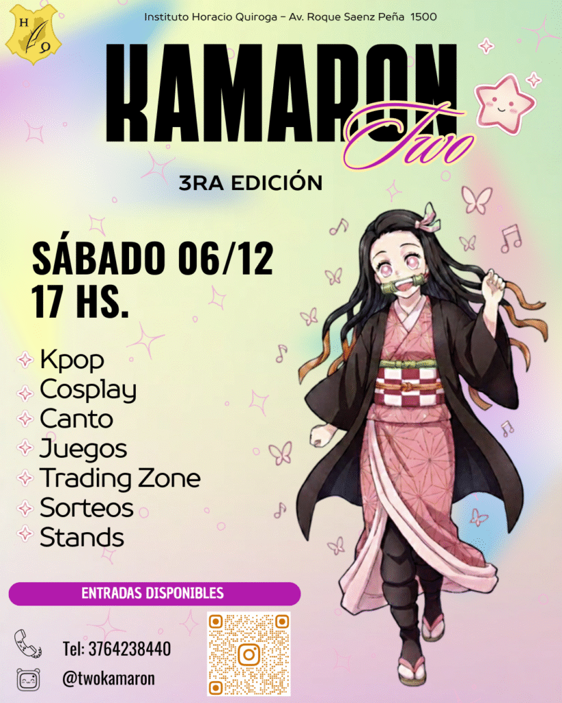 El Instituto Horacio Quiroga invita a toda la comunidad educativa y al público en general a participar del evento cultural “Kamarón Two”, que se llevará a cabo el día 3 de octubre de 2025 en nuestra sede institucional, ubicada en Av. Roque Sáenz Peña 1500, Posadas, Misiones.